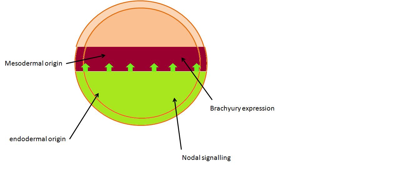 Nodal activation occurs Vg1 binding to TGFβ receptors and stimulating the intracellular Smad mechanism (FigIIIa). Nodal is expressed in a concentration gradient steming from the vegetal pole. This causes different cell fates, cells with the highest Nodal concentrations eventually differentiate into definitive endoderm. Cells that recieve a medial concentration become mesoderm, which is located as in band around the equator of the embryo (FigIIIb)